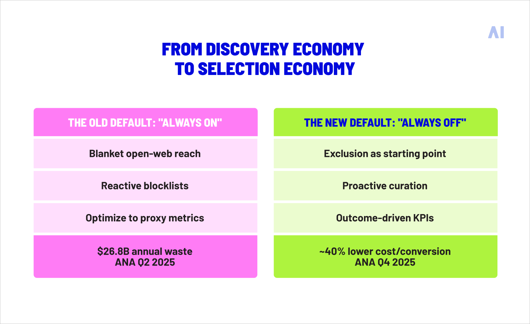 Because AI is simultaneously reshaping how users discover content, the market is being squeezed from both ends: weaker traffic quality in certain environments, and greater pressure to demonstrate value in the placements that remain. More inventory does not resolve this. Better filtering does.